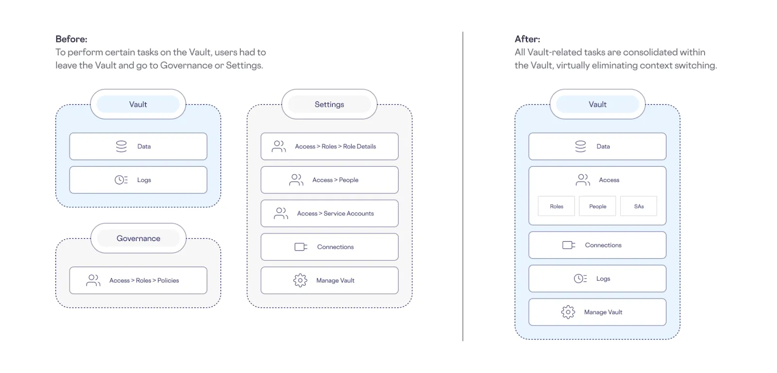 - Errors Caused by Lack of Context: For example, we noticed some cases where developers created a service account for the wrong vault because they lacked contextual clues, and addressed these cases in the new UI.
