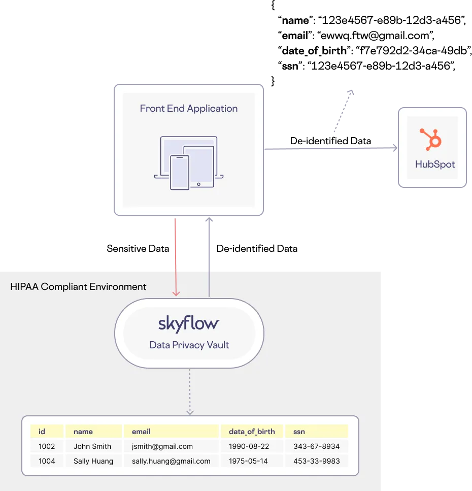 Sensitive customer data, such as PHI, is sent directly to your Skyflow vault via a Skyflow SDK or direct API integration, bypassing HubSpot's infrastructure. The vault stores the regulated data within a HIPAA-compliant environment and returns non-exploitable de-identified data as references.