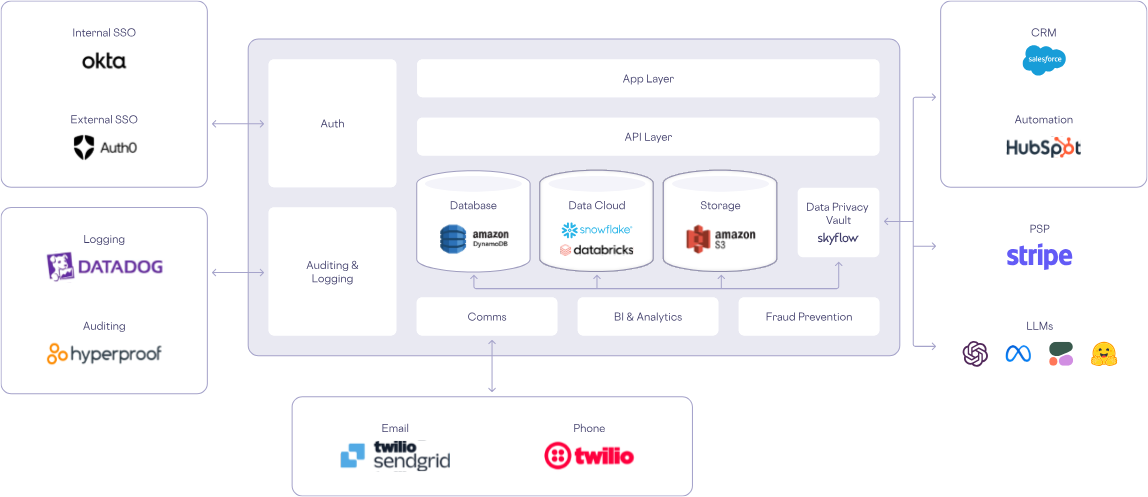 - Centralized Control: The vault centralizes all security controls, including fine-grained access policies, automated key management (BYOK supported), and immutable audit logs, eliminating the need to implement these complex security controls individually across dozens of infrastructure points. Skyflow also helps in establishing the relationship between the personal data types, along with advanced techniques for unstructured data and AI workflows.