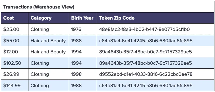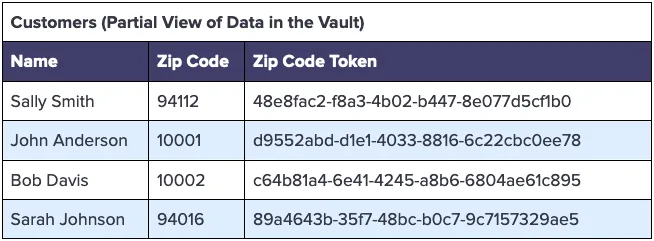 In some cases, you might need to re-identify these zip codes to add context to your aggregate analytics. For example, you might need to know which location is responsible for the most spending, or the least spending, to inform marketing efforts. To do this, you can detokenize the zip code token to retrieve the original value. Using tokens in this way gives you selective sensitive data access when you need it to interpret analytics, while keeping sensitive data out of your data warehouse.