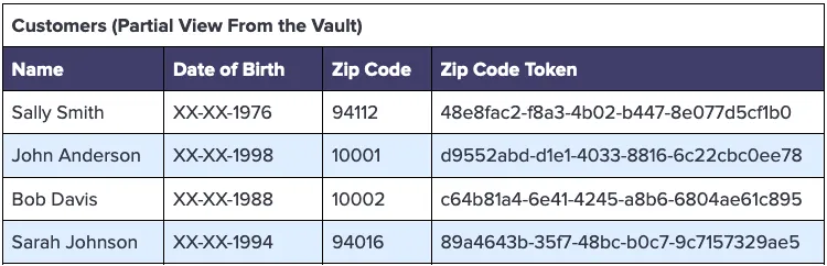A partial view of the Customers table in the vault, with these redaction and tokenization settings, would look like the following: