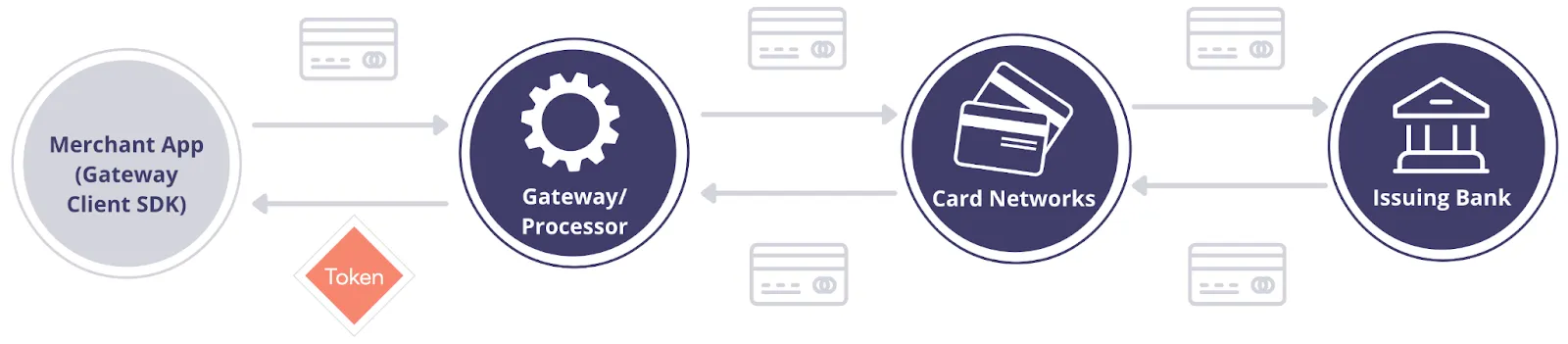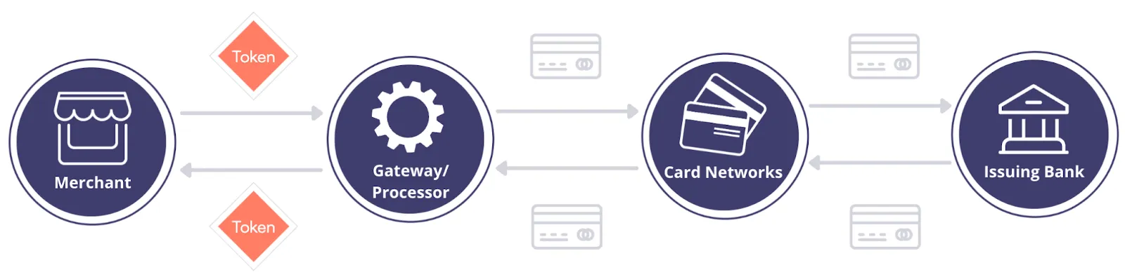 When you need to charge a credit card, you call the payment service APIs using these tokens (as shown above). Next, the PSP converts these tokens to the original values and routes the transaction to the correct card network – Visa, Mastercard, etc.