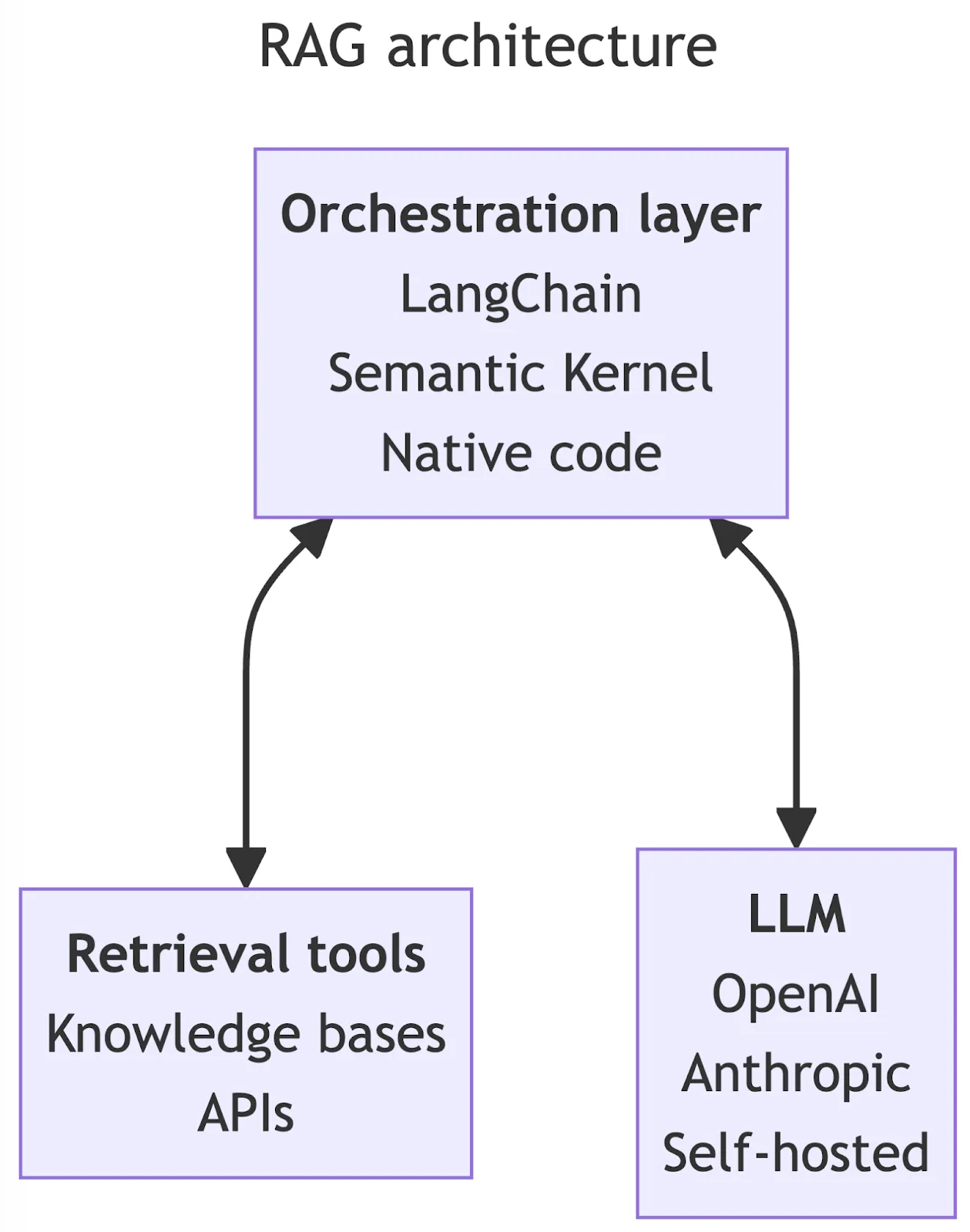 - The orchestration layer receives the user's input in any associated metadata (like conversation history), interacts with all of the related tooling, ships the prompt off to the LLM, and returns the result. Orchestration layers are typically composed of tools like LangChain, Semantic Kernel, and others with some native code (often Python) knitting it all together.
