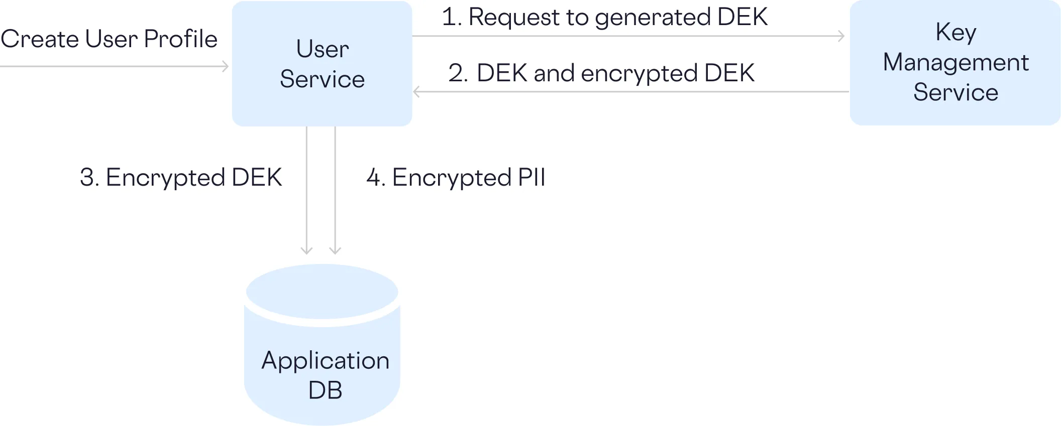 If we use envelope encryption where a data encryption key (DEK) is used to encrypt the actual PII data, and then the DEK itself is encrypted with a separate key encryption key (KEK), then each user insert operation looks as follows.