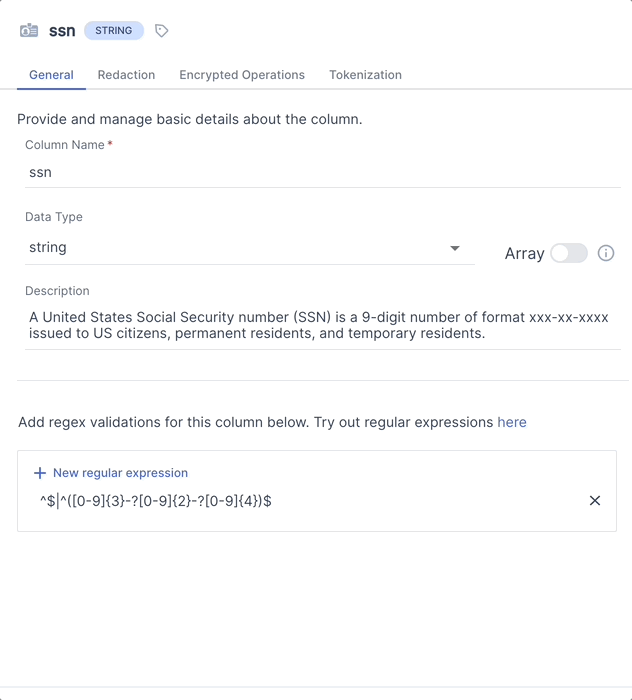 - Format-preserving tokens: This data type also uses format-preserving tokens, so a real SSN would be tokenized into a string like 456-78-9876 for storage in your systems.