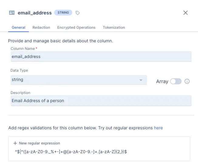 - Masking: The default redaction rule makes an email address like johndoe@acme.com appear as ***@acme.com by default, so you can reference an email address without having to fully decrypt it first.