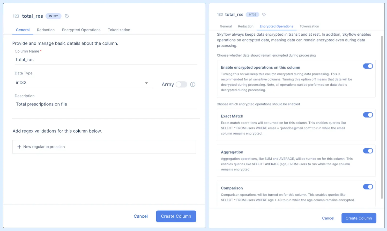 To track prescriptions on file, you can start with a basic numeric field like int32. Then, change the name for your new field to something like total_rxs and make a few other changes to tailor it to your needs. New data types created from the int32 type are already fully-masked, so you’ll just need to configure support for encrypted operations like aggregation, and then choose tokenization settings. In a matter of minutes, you’re ready to track prescriptions by customer while keeping this data private and enabling anonymized aggregate analytics.