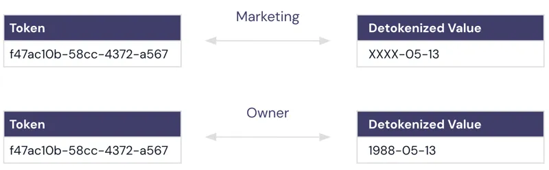 Even if you can add some additional magic to control access to who can detokenize data based on their identity, since the token map has no knowledge of the datatype, they’re all just strings, applying data masking based on identity gets complicated.