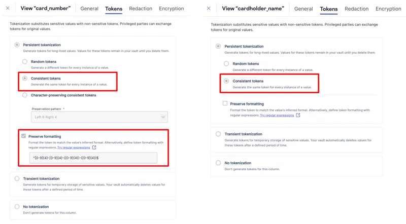 Each column within the schema can define its own custom format rules, allowing you to generate any kind of token. In the example image below, you can see the settings for a format-preserving consistently generated token for a credit card number, and also a consistently generated token in the form of a UUID for a cardholder name.