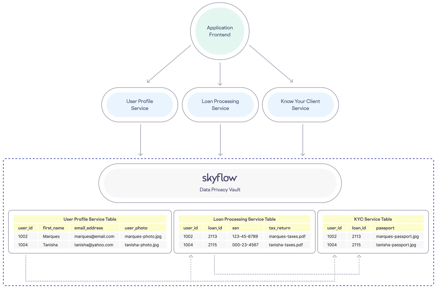 Skyflow Data Privacy Vault provides an API that enables lightweight and uniform development for sensitive data workflows, and that handles the business logic required to associate an S3 URL with a specific row. With a few simple calls to Skyflow APIs, a loan issuance service can upload and download a sensitive file associated with a specific user.