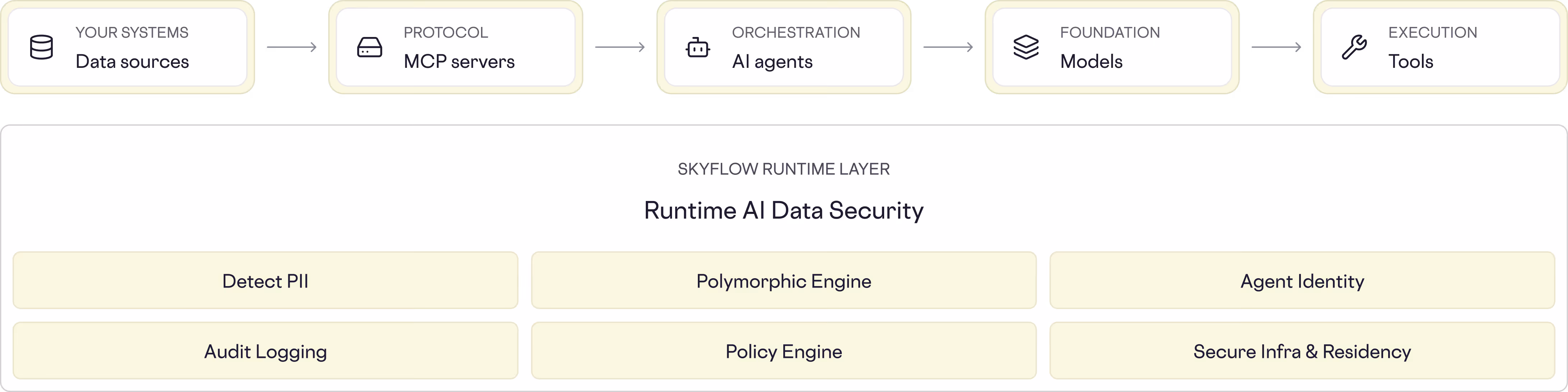 Skyflow sits between your data sources, MCP servers, agents, and models — protecting data in real time without interrupting workflows.