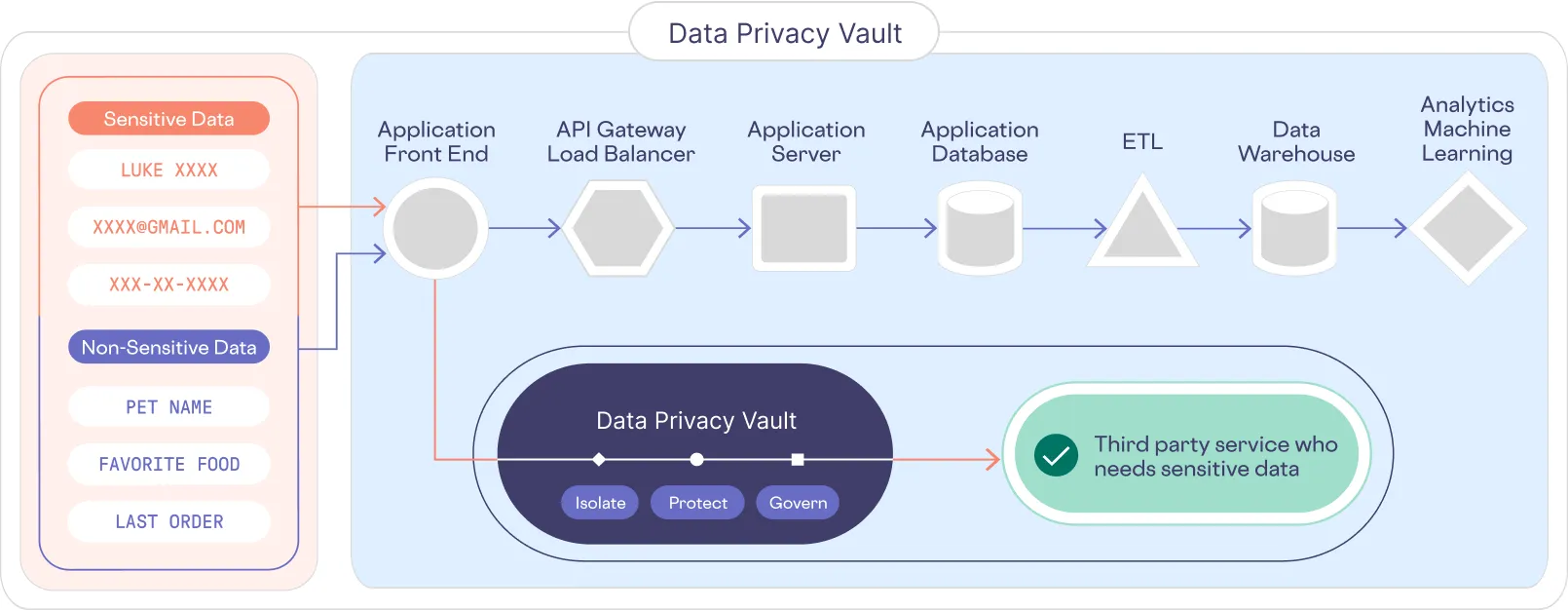 This architectural pattern, known as a data privacy vault (shown below), is also recommended as the future of privacy engineering by the IEEE.