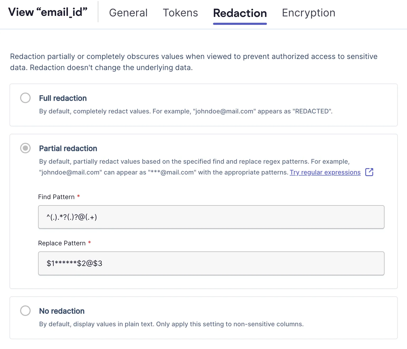 Skyflow supports masking defaults for most forms of PII, but the masking functionality is very flexible and can be configured to support any application-specific masking rules. For example, in the image below, the “email_id” column has a masking rule that preserves the first character and last character of the local address and preserves the domain, all other characters are replaced by the * character.