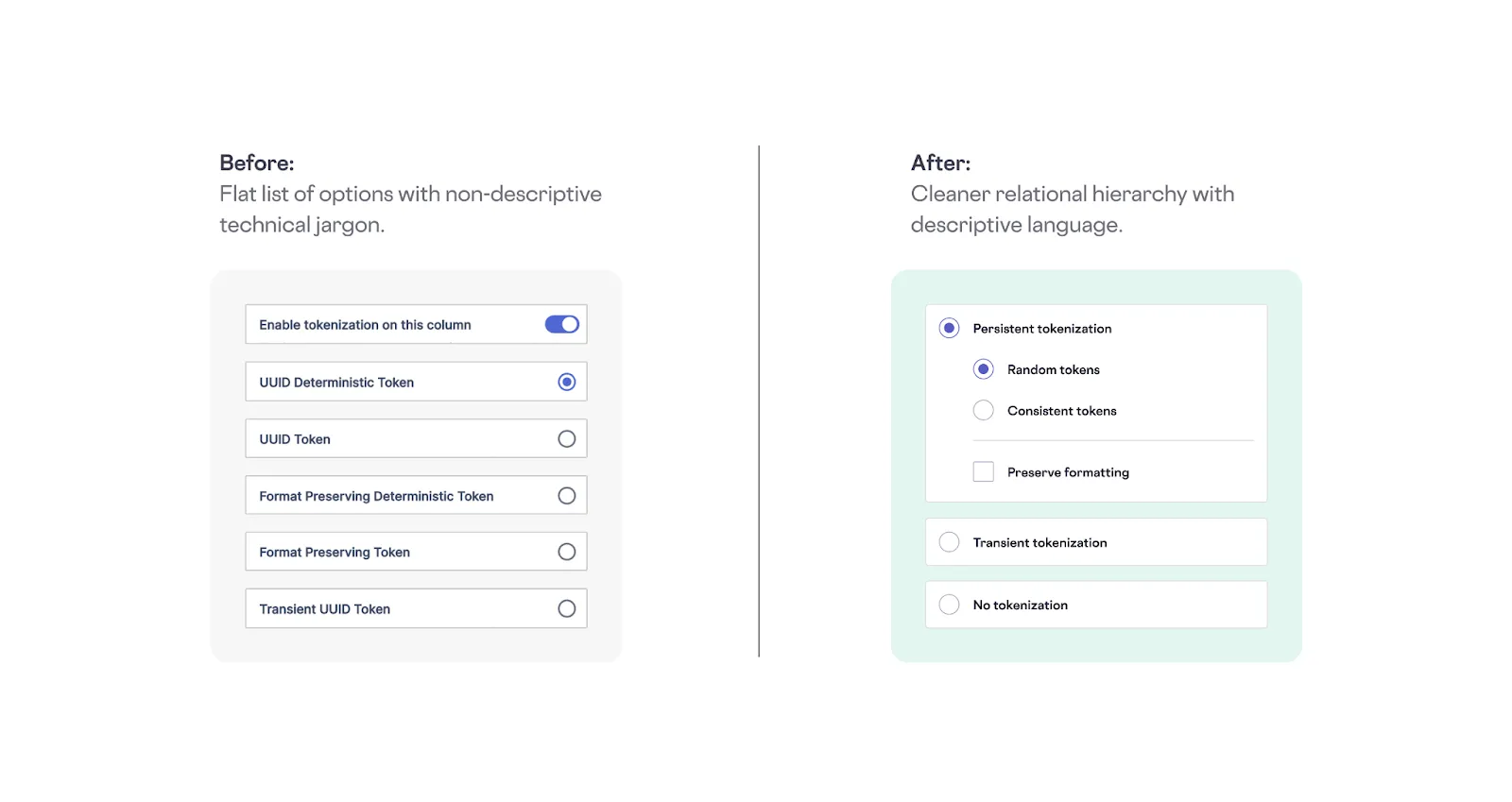 For example, when redesigning our tokenization settings UI, we replaced a flat, terminology-heavy UI with a cleaner hierarchy that uses more inclusive language.