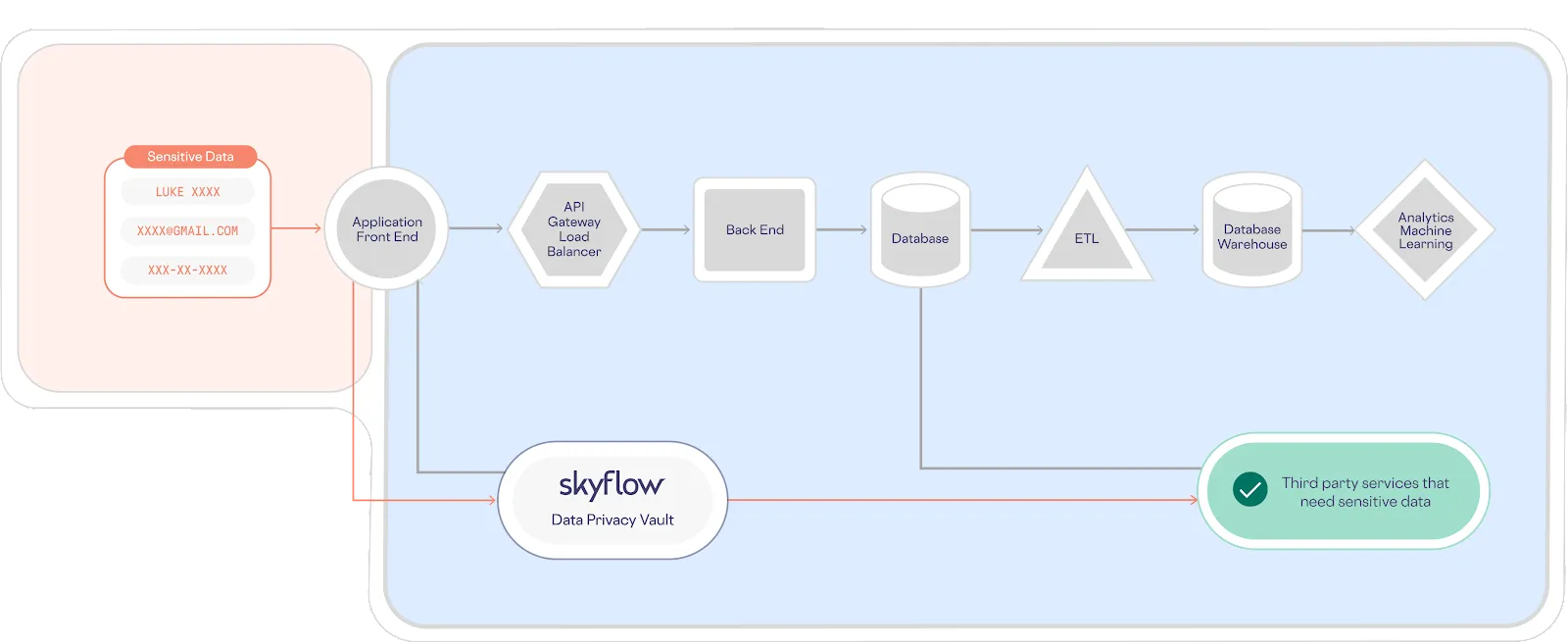 With Skyflow Data Privacy Vault, you avoid the problem of data sprawl, which makes protecting sensitive data and managing compliance difficult and error-prone. Instead of the “sprawl” that occurs when sensitive information is endlessly replicated across your systems and services, Skyflow gives you an architecture like the one shown below, making it easy to isolate, protect, and govern sensitive data:
