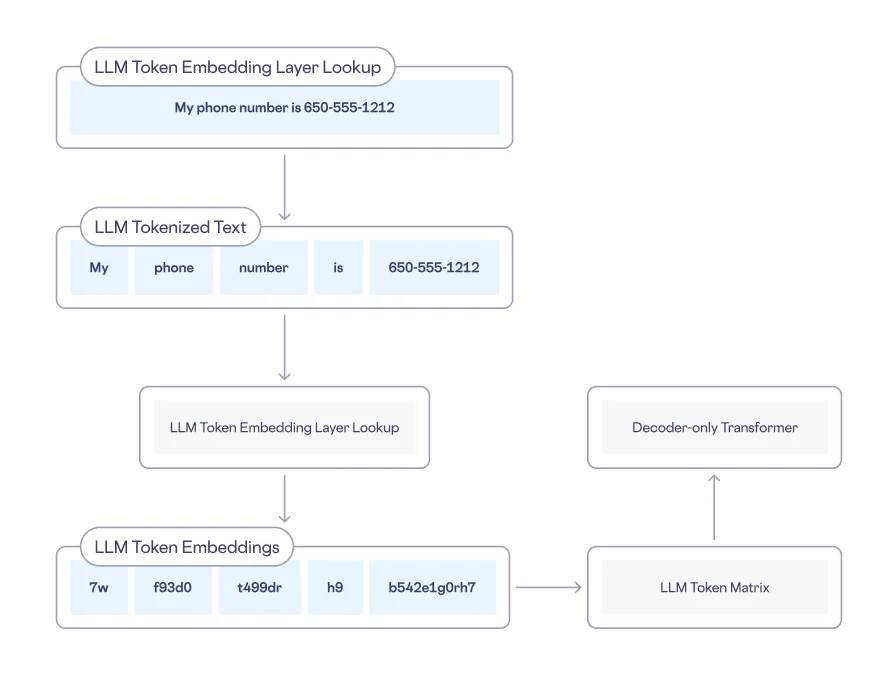 For example, when a user inputs a phrase containing their phone number, that data is converted into LLM tokens as part of the model training workflow, as shown below: