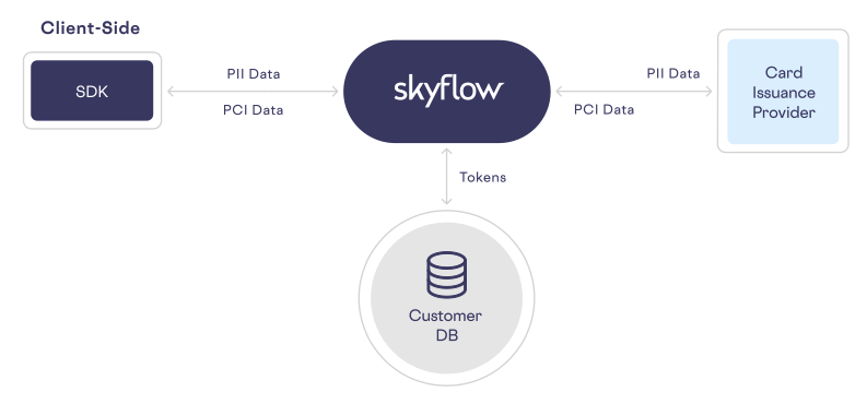 - New client-side SDKs for iOS, Android, and JavaScript make it easy to securely collect and tokenize sensitive data from within mobile or web apps. These SDKs give you full control over the customer experience, so you can isolate your environment from sensitive data while controlling the customer experience. For example, you can use Skyflow Elements to securely reveal the primary account number (PAN), expiration date, and CVV of the newly issued card to the end user without exposing your front-end to any PCI data.