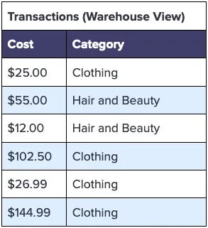Spending habits could mean a variety of things, but let’s assume you need to know total spending across all customers by shopping category. You can easily accomplish this using just the cost and category values from the Transactions table found in your data warehouse. Your analysis might look like the following: