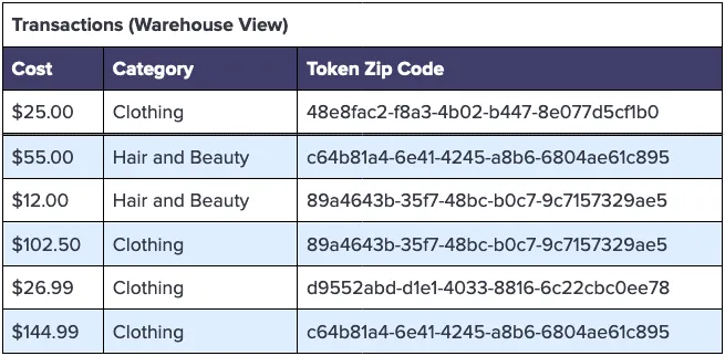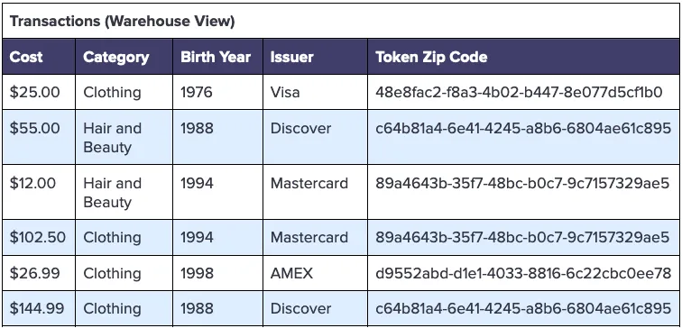 In some cases, you might need to re-identify these zip codes to add context to your aggregate analytics. For example, you might need to know which location is responsible for the most spending, or the least spending, to inform marketing efforts. To do this, you can detokenize the zip code token to retrieve the original value. Using tokens in this way gives you selective sensitive data access when you need it to interpret analytics, while keeping sensitive data out of your data warehouse.