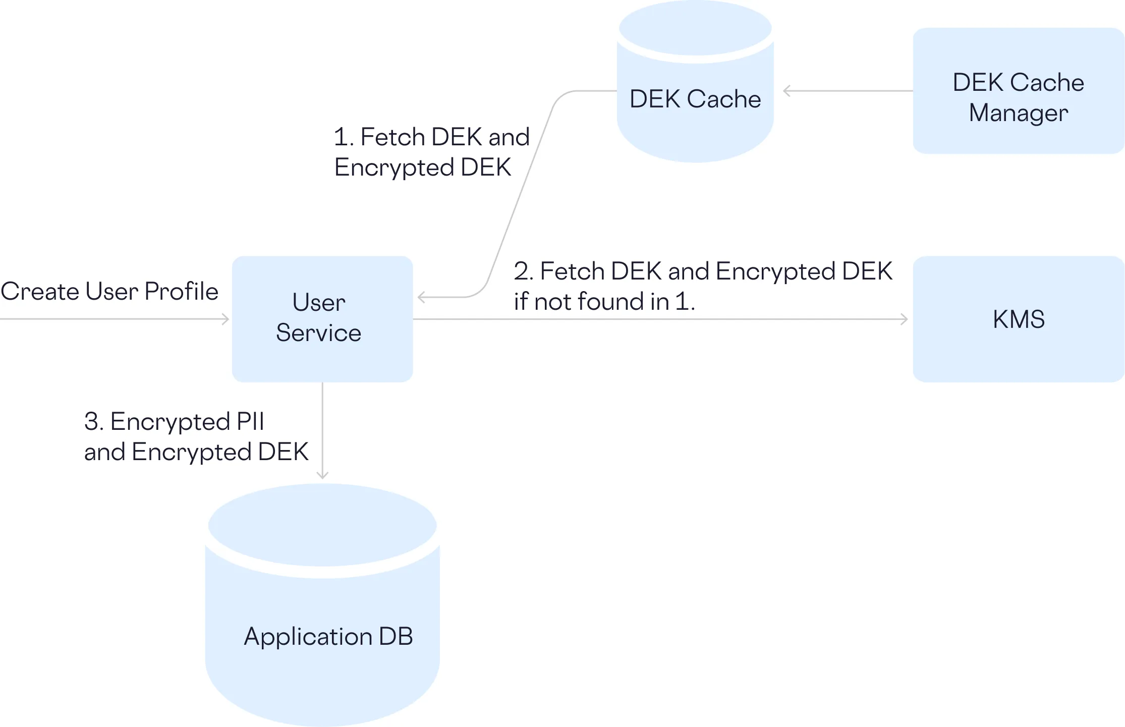 If we use envelope encryption where a data encryption key (DEK) is used to encrypt the actual PII data, and then the DEK itself is encrypted with a separate key encryption key (KEK), then each user insert operation looks as follows.