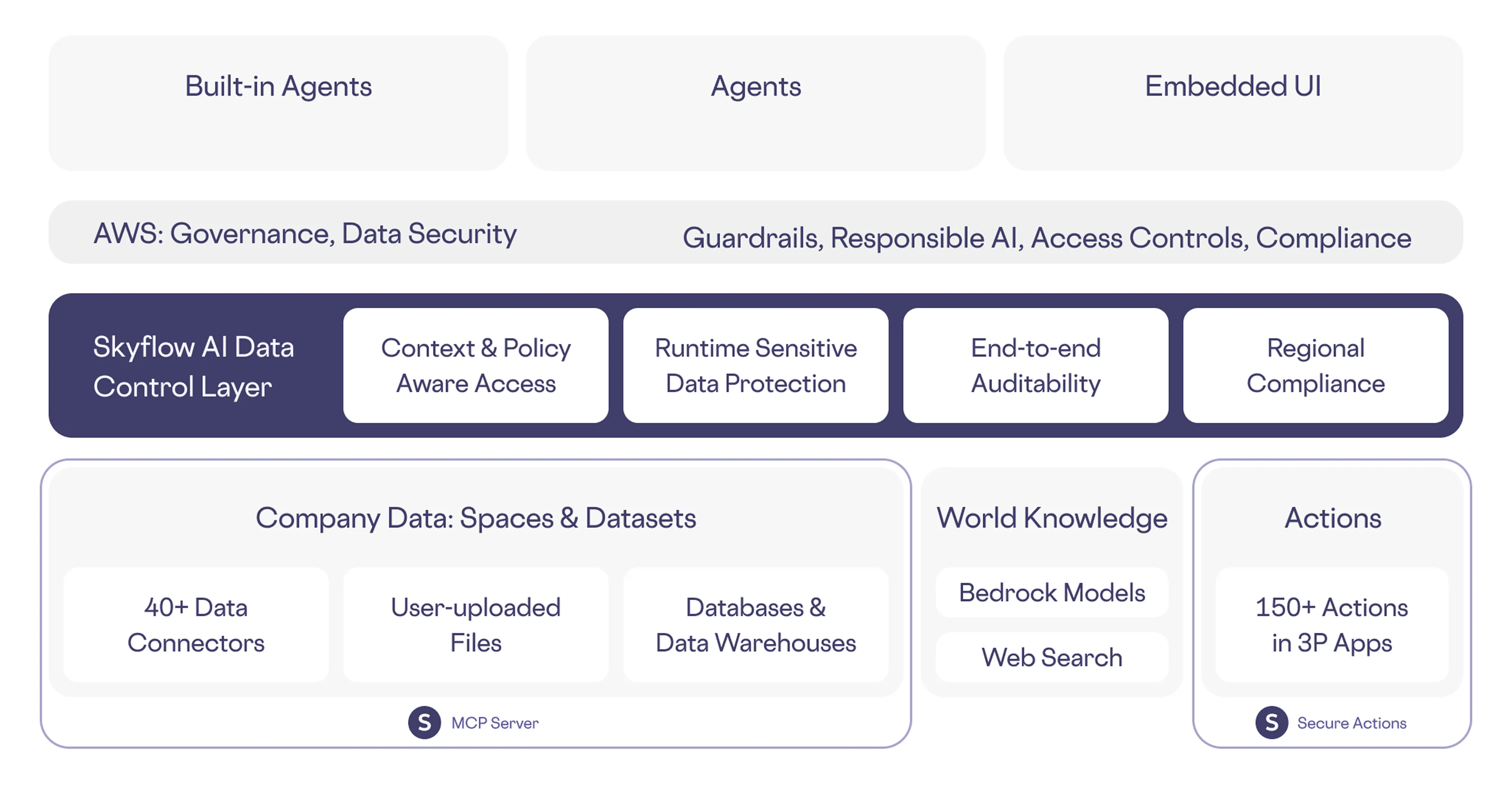 Skyflow Runtime AI Data Security solution addresses this by providing the dedicated Data Control Layer, delivering runtime, field-level, and identity-aware protections with additional visibility and enforceable policies that ensure data remains protected at every step, complementing AWS’s capabilities for regulated and enterprise environments.